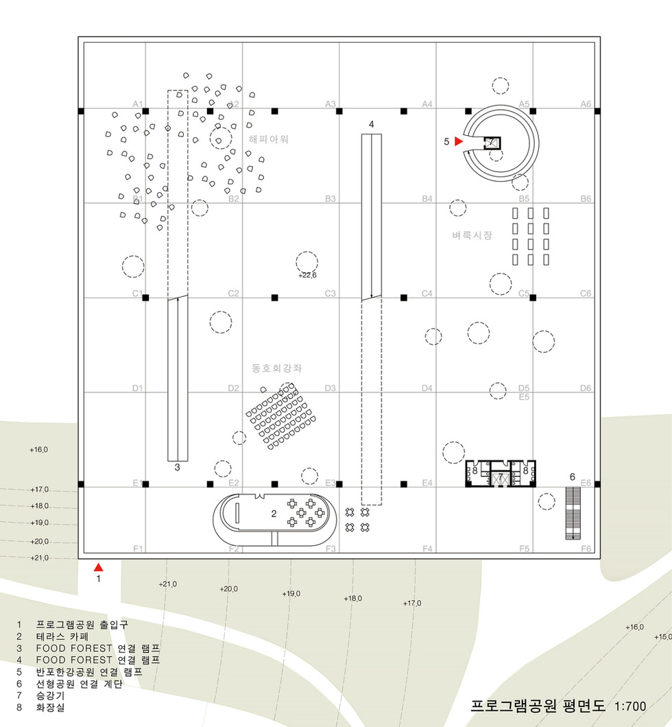 이중 구조 중 하부 공원은 버스킹, 동네 파티, 벼룩시장, 전시 등 다양한 프로그램이 가능한 열린 광장으로 계획하고, 상부 공원은 높이가 다른 다양한 나무들을 사용해 ‘진짜 숲’을 조성한다. 다만 이 숲은 ‘food forest’다. 도시의 숲도 생산이 가능하다는 사실을 보여주는 숲이다. 작은 오솔길만이 존재하는 이 숲은 근처 아파트 주민의 프라이버시를 보호하기 위한 계획이며, 하부의 다양한 활동이 가능한 열린광장과 함께 완성된다. 이중 구조의 공원은 도로 위에 건설되는 공원의 적극적인 활용에 대한 제안이며, 또한 이 덮개공원이 도시의 삶과 한강의 자연 모두에 더 쉽게 녹아들게 하고자 계획했다.